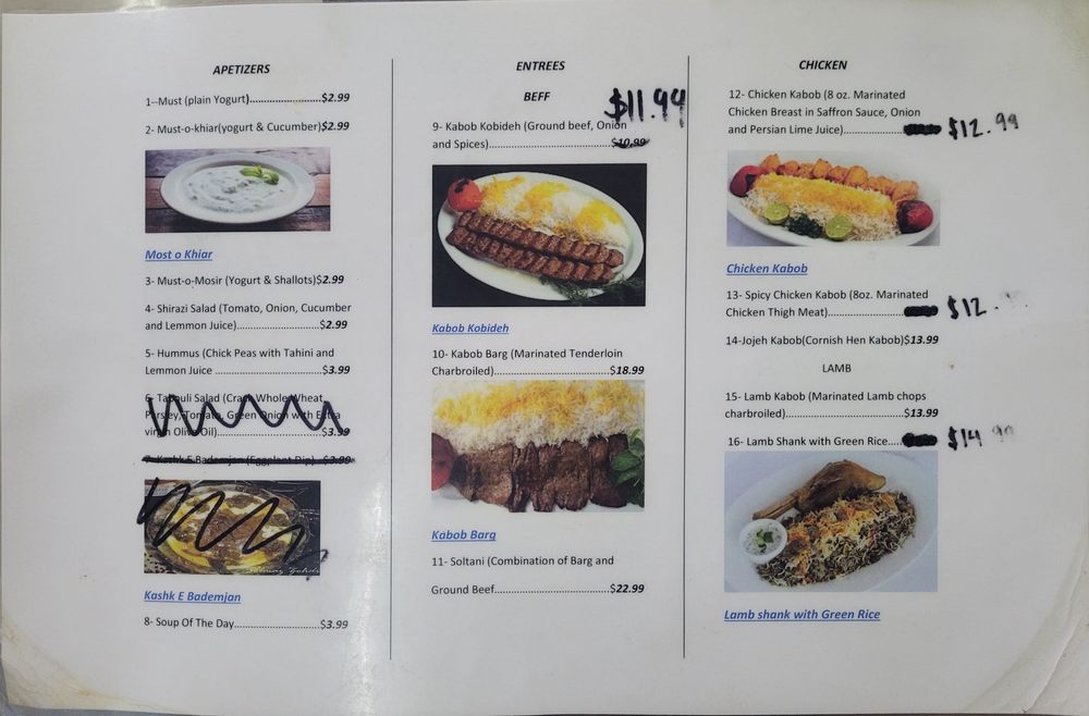 ( oz.marinated chicken breast in saffron sauce, onion and persian lime juice).